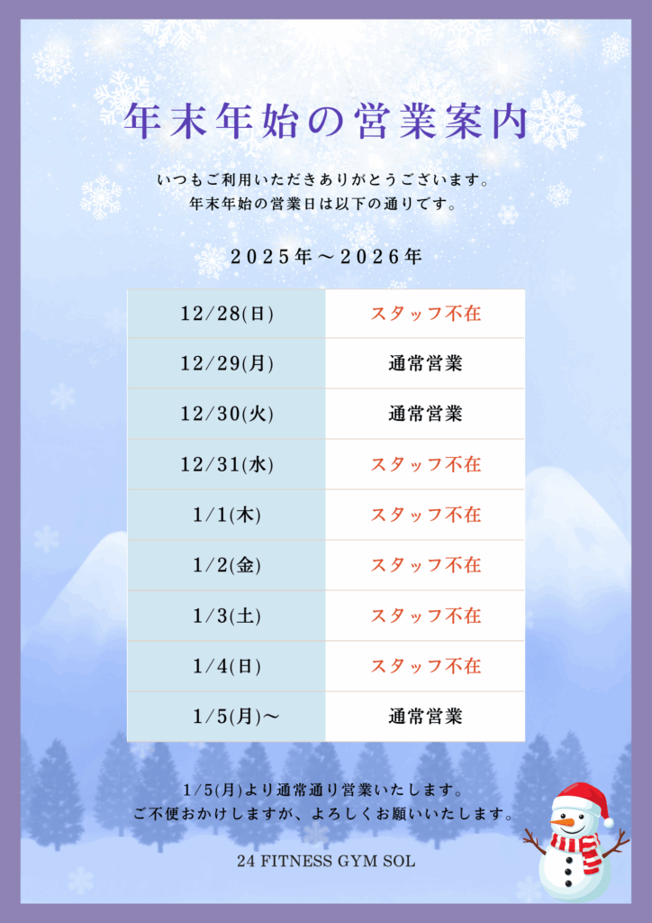 年末、12月31日〜1月4日迄はスタッフは在中しておりません。